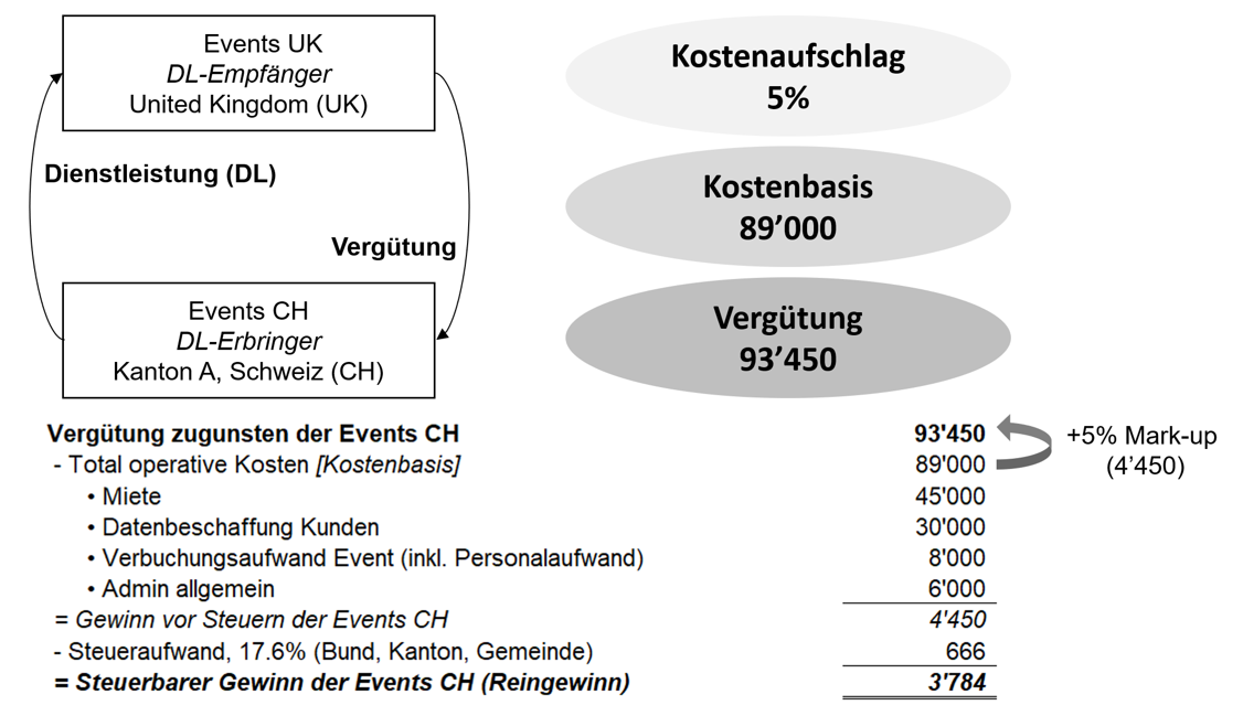 In Übereinstimmung mit den OECD-Leitlinien wird der lokale Steueraufwand bei der Ermittlung der Kostenbasis nicht berücksichtigt, womit für die Events CH ein Dienstleistungsertrag von CHF 93 450 resultiert: