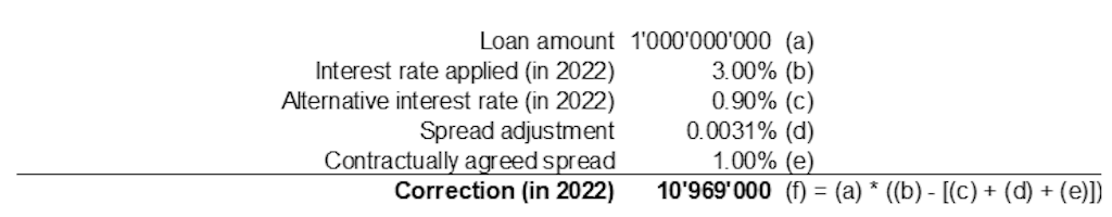In this case, an independent bank would have followed the SNB's recommendations, and would thus have calculated an interest rate based on the SARON and the 100 bps spread that was agreed between the parties when the contract was concluded in 2021. The interest rate that should be used from 1 January 2022 onwards is 2.5% (i.e. 1.5% + 100 bps). Consequently, for the 2022 tax period, part of the recognised financial expense is not a business-related expense and must be corrected. The hidden profit distribution amounts to CHF 5 million (i.e. 0.5% x 1 billion), as the interest rate paid by company A was 3% instead of 2.5% in accordance with the SNB's recommendations.