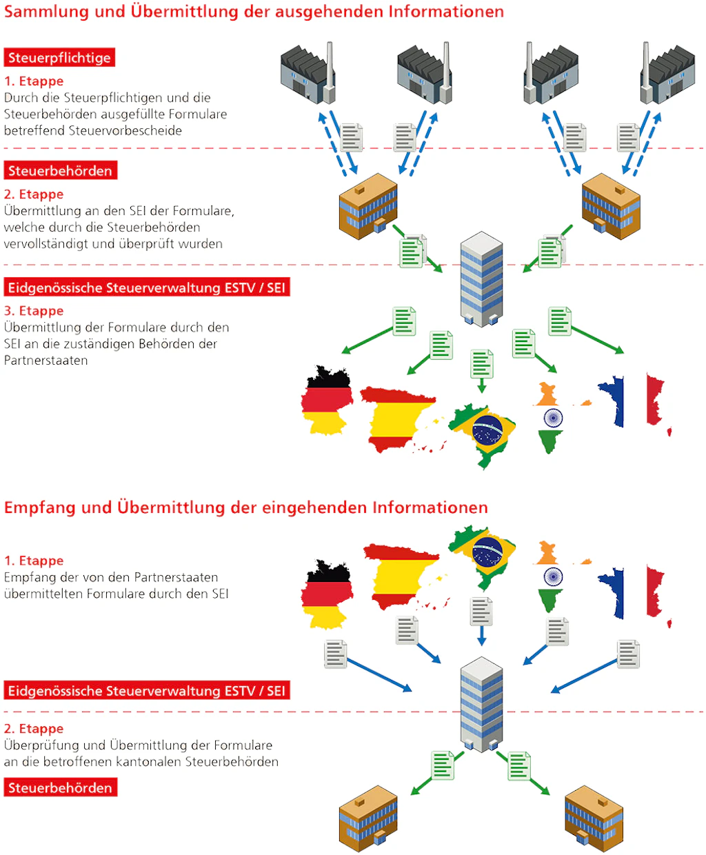 As part of the automatic exchange of information, partner states regularly, and without prior request, provide each other with information on financial accounts, as well as country reports, for example. The procedure is based on the Federal Act on the International Automatic Exchange of Information in Tax Matters (AEOIA).