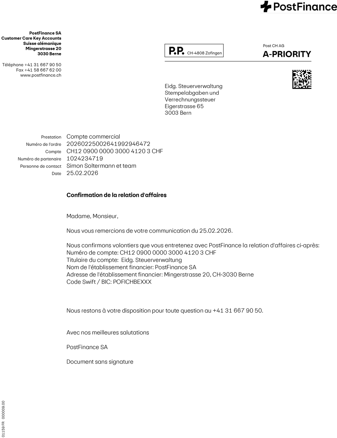 PostFinance CH12 - Confirmation de la relation d'affaires