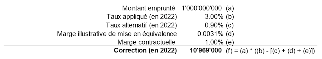 Dans ce cas de figure, une banque indépendante aurait suivi les recommandations de la BNS et ainsi calculé un taux d’intérêt sur la base du SARON et de la marge de 100 bps convenue entre les parties lors de la conclusion du contrat en 2021. Le taux d’intérêt qui devrait donc être appliqué à partir du 1er janvier 2022 est de 2,5 % (i. e. 1,5 % + 100 bps). Par conséquent, pour la période fiscale 2022, une partie des charges financières comptabilisées n’est pas justifiée commercialement et doit être corrigée. La distribution dissimulée de bénéfice, respectivement la prestation appréciable en argent, s’élève à CHF 5 millions (i. e., 0,5 % * 1 milliard) puisque le taux d’intérêt payé par la société A s’est élevé à 3 % au lieu de 2,5 % selon les recommandations de la BNS.